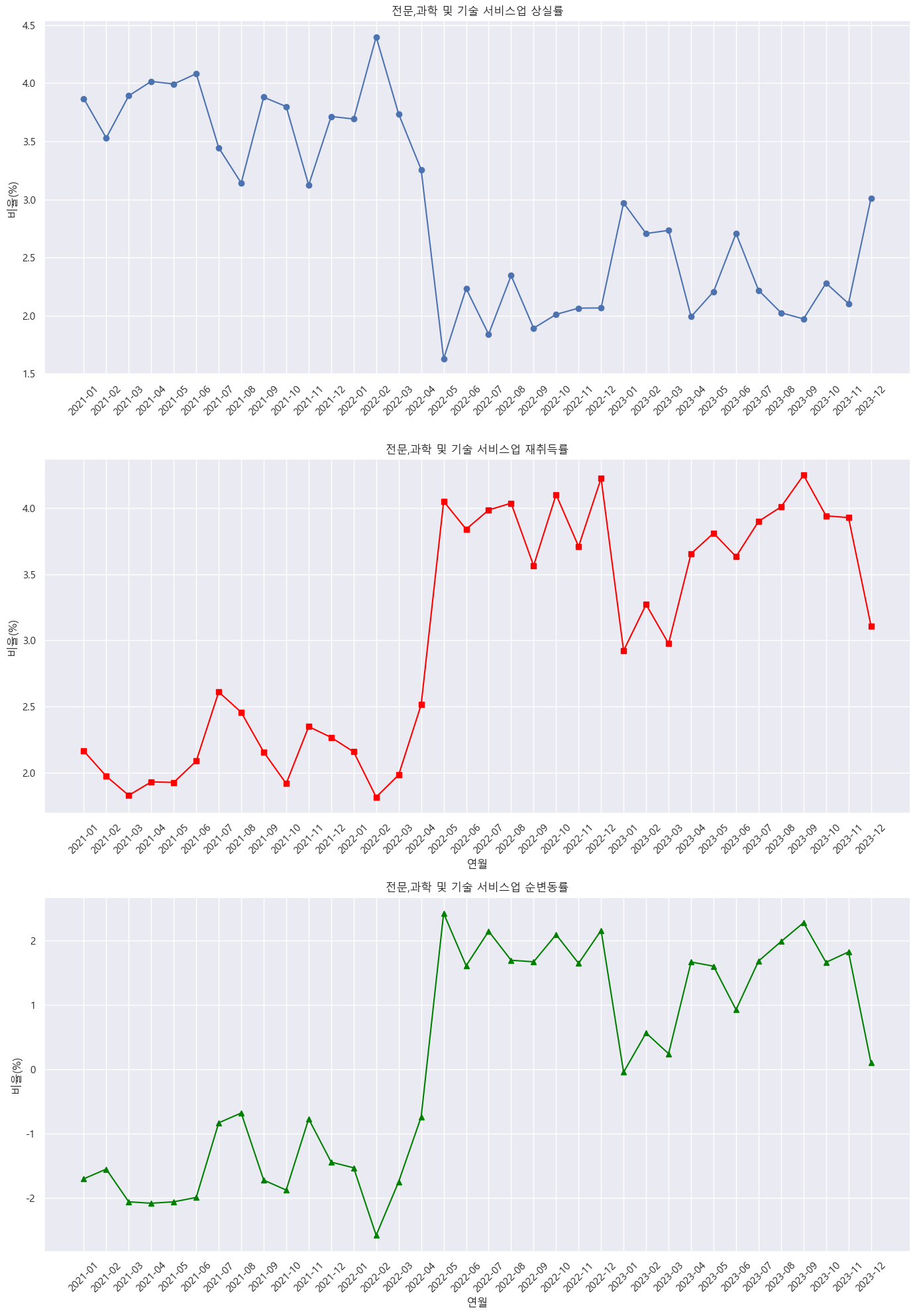 - 전문·과학 및 기술 서비스업은 코로나 이후 상실률 감소, 재취득률 상승 추세