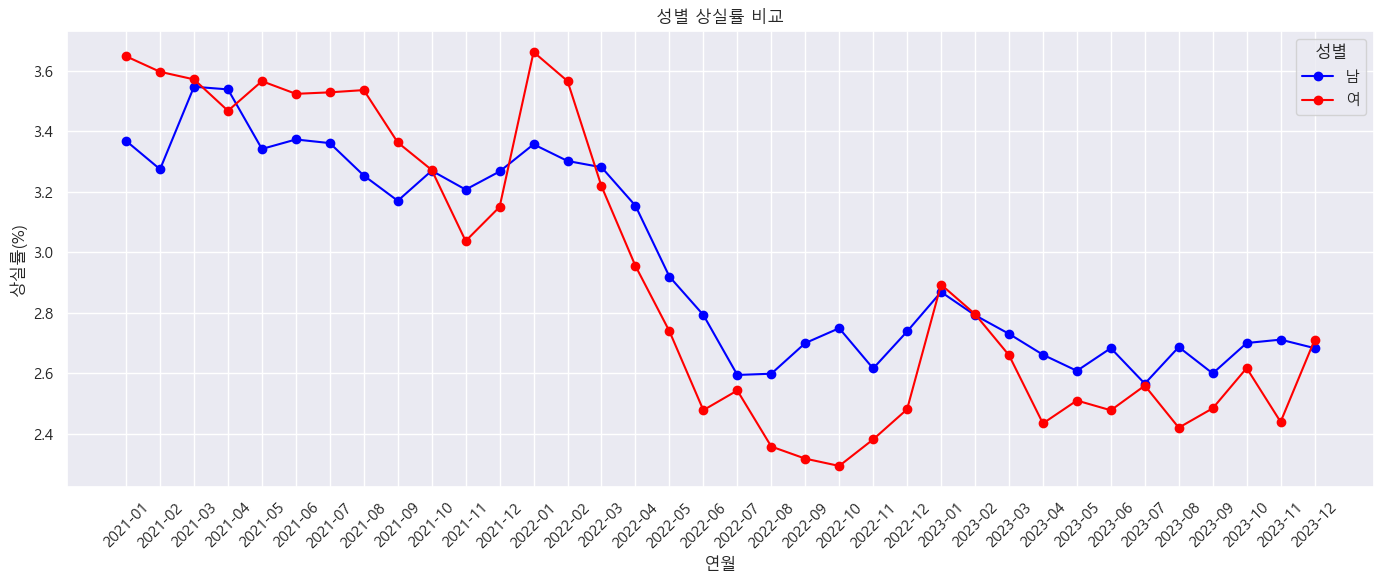 - 여성은 남성에 비해 전반적으로 재취득률이 더 높은 추세를 보이며, 특히 연초(1~3월)에 그 차이가 뚜렷하게 나타난다. 다만, 같은 시기에 상실률도 함께 상승하다가 낮아지는 경향을 보인다.