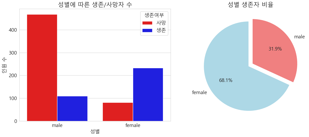 성별 생존율 및 생존자 수