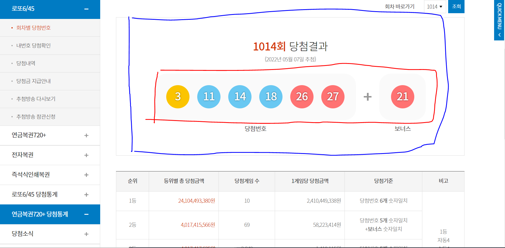 1014회 당첨결과 (2022년 05월 07일 추첨) 당첨번호 3 11 14 18 26 27 1014회 순위별 등위별 총 당첨금액, 당첨게임 수, 1게임당 당첨금액, 당첨기준, 비고 안내 순위 등위별 총 당첨금액 당첨게임 수 1게임