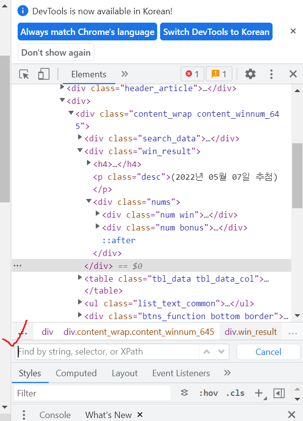 div.nums 를 검색하면 검색 결과가 하나인걸 볼 수 있다.